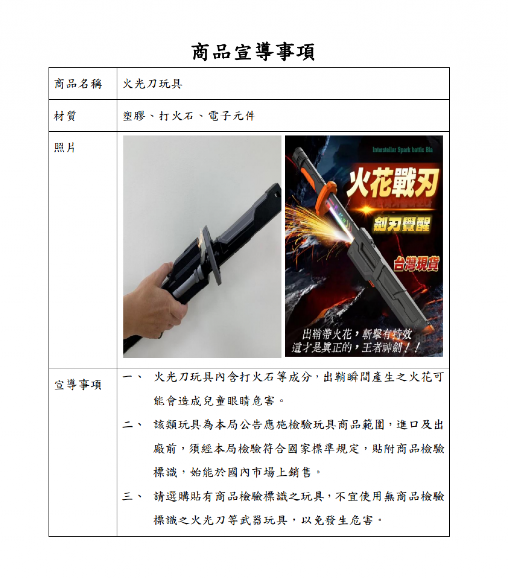 一、查火光刀玩具係屬武器玩具,屬本局公告應施檢驗玩具商 品範圍,進口及出廠前須經本局檢驗符合CNS 4797-3等規 定,貼附商品檢驗標識,始能於國內市場上銷售。 二、火光刀玩具內含打火石等成分,玩具出鞘瞬間產生之火花 可能會造成兒童眼睛危害,應選購貼有商品檢驗標識 之玩具,及不宜使用無商品檢驗標識之火光刀等武器玩 具,以免發生危害。